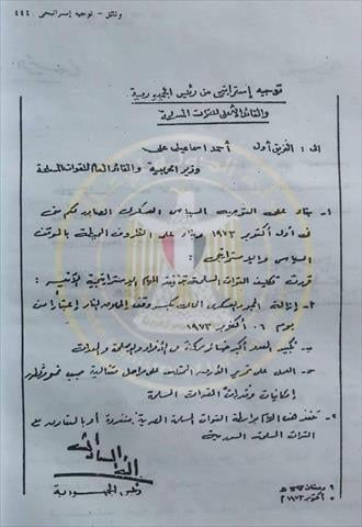 وكتب السادات بخط يده: "إلى الفريق أول أحمد إسماعيل وزير الحربية والقائد العام للقوات المسلحة، بناء على التوجيه السياسي العسكري الصادر لكم مني في أول أكتوبر 1973 وبناء على الظروف المحيطة بالموقف السياسي والاستراتيجي قررت تكليف القوات المسلحة بتنفيذ المهام الاستراتيجية الآتية: