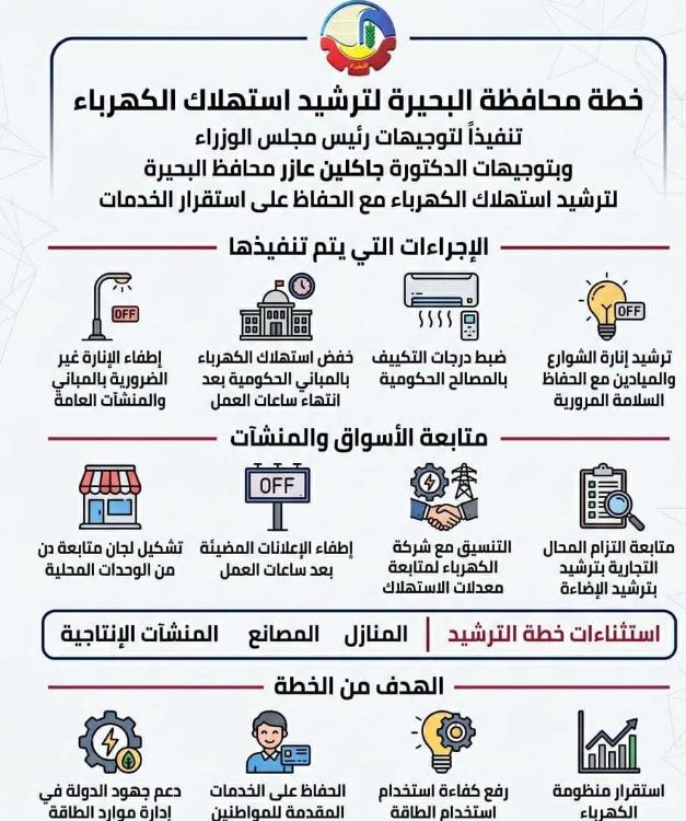 وأكدت الدكتورة جاكلين عازر، أن المحافظة ستواصل المتابعة الميدانية المستمرة بكل المراكز والمدن، لضمان تنفيذ الإجراءات على أرض الواقع وتحقيق مستهدفات الدولة في رفع كفاءة استخدام الطاقة والحفاظ على استقرار منظومة الكهرباء، بما ينعكس إيجابًا على جودة الخدمات المقدمة للمواطنين.