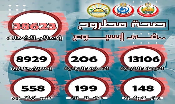 وأكد أنه تم توقيع الكشف الطبي وإجراء الفحوصات لعدد 13,106 مترددين على العيادات الخارجية الصباحية والمسائية في مختلف التخصصات، كما تم إجراء 206 عمليات جراحية، من بينها 16 عملية ذات مهارة، و78 عملية كبرى، و65 عملية متوسطة، و47 جراحة صغرى، كما تم إجراء 498 تدخلًا جراحيًا بسيطًا بالاستقبال والطوارئ والعيادات الخارجية خلال نفس الفترة.