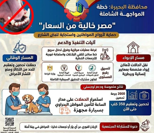 وأصدر المكتب الإعلامي لمحافظة البحيرة انفوجرافا يوضح تفاصيل الخطة وآليات تنفيذها على أرض الواقع، والتي تهدف إلى الحد من تزايد أعداد الكلاب الضالة والسيطرة على الظاهرة بشكل كامل.