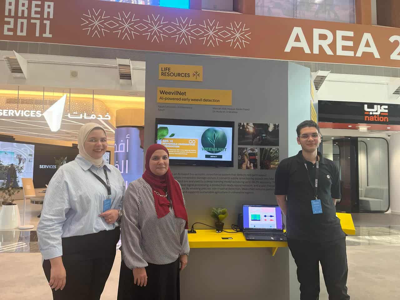من جانبه قال الطالب نادر فايد، إن مشروعه "ويفيل نت"، هو نظام مراقبة حيوي صوتي قائم على الذكاء الاصطناعي، للكشف عن إصابات سوس النخيل الحمراء، قبل حدوث أضرار لا يمكن إصلاحها، حيث يحول أصوات الحفر الطفيلية إلى مخططات، وتحللها شبكة تعلم عميق بدقة تصل إلى 98.2%.