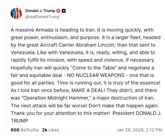 وقال في تدوينة عبر صفحته الرسمية بمنصة «تروث سوشيال»، اليوم الأربعاء، إن «هناك أسطولًا ضخمًا يتجه نحو إيران بسرعة»، مضيفًا: «الأسطول المتجه نحو إيران أكبر من الذي أرسلناه إلى فنزويلا وقادر على تنفيذ مهمته بقوة إذا لزم الأمر».