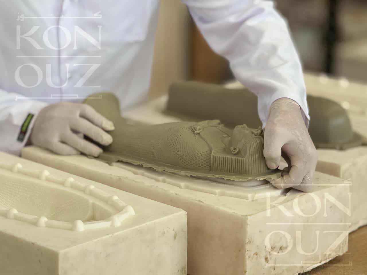 من جهته، أوضح اللواء هشام شعراوي رئيس مجلس إدارة شركة كنوز مصر للنماذج الأثرية أن تصميم الدعوة مر بعدة مراحل دقيقة عكست الحس الفني المستمد من إرث مصر الحضاري، بدءًا من مرحلة النحت التي تولى فيها الفنانون تجسيد الزخارف والرموز والكتابات الهيروغليفية بدقة متناهية، مرورًا بعمليات الاستنساخ والتذهيب والتلوين، وصولًا إلى تغليف التابوت من الداخل بقماش المخمل الفاخر.